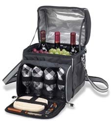 Ballistic nylon wine and cheese cooler for 4 people. Cooler includes room for food and bottle dividers to hold three bottles upright and to separate food from beverages . Includes acrylic wine glasses, napkins, corkscrew, hardwood cutting board, and cheese knife. Adjustable shoulder strap to carry. Read more...